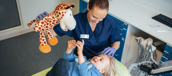 Здесь — мультики на потолке, мягкие игрушки в руках, знакомство с «щекоталкой» (зубной щёткой), «пылесосом» (слюноотсосом), и даже бор-машина здесь поёт, а не рычит.